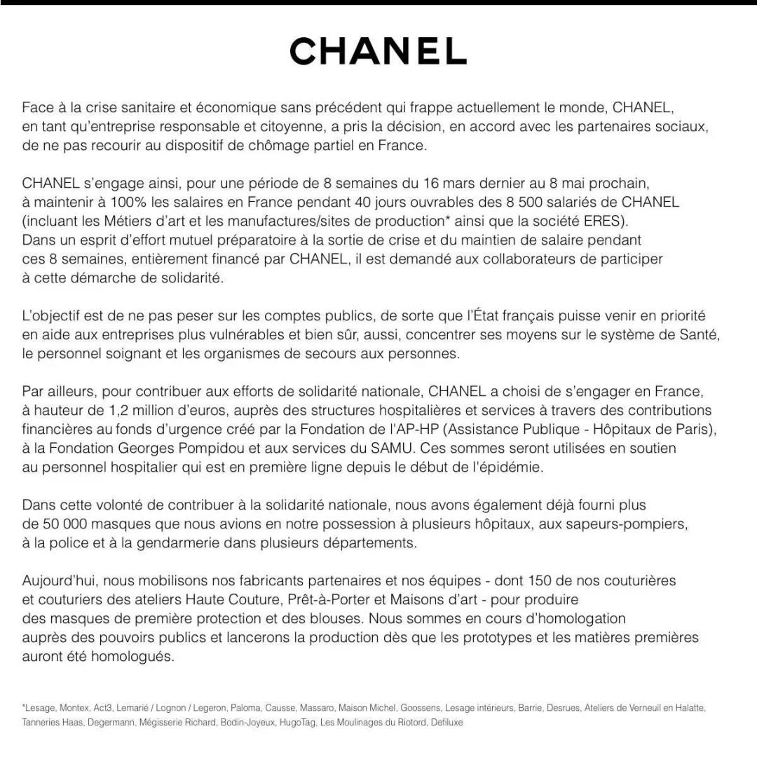 面对着疫情的蔓延,香奈儿已经关闭了自己在法国、瑞士和意大利的高定、成衣和高级钟表工坊,但它表示在3月16日至5月8日的40个工作日内,自己目前拥有的8500员工都能领到全额工资。