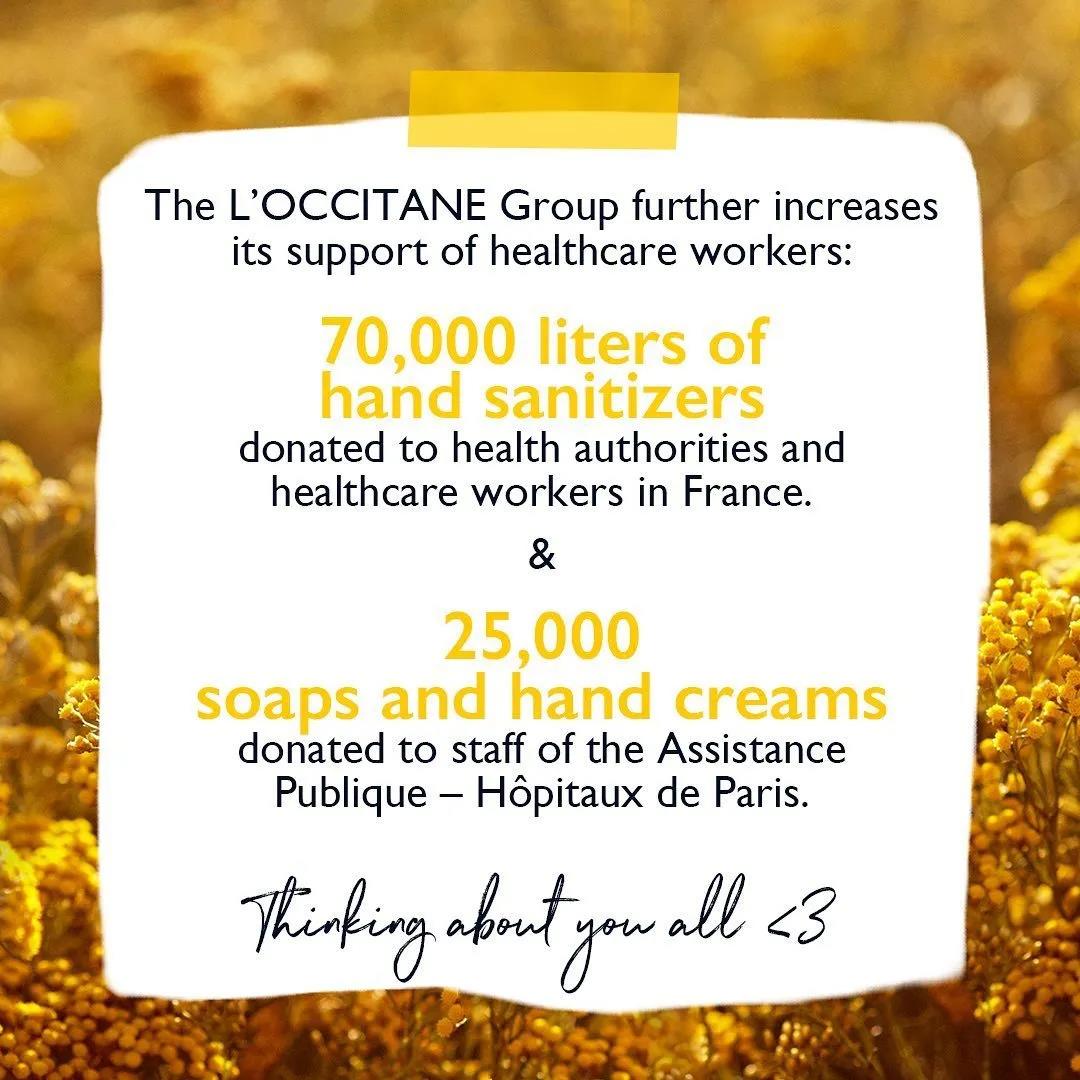 早在3月15日,它就宣布将旗下品牌迪奥、纪梵希和娇兰的美妆香水生产线暂时改造,用以生产大量含酒精洗手液,免费且优先支援巴黎公共援助医院联盟(AP-HP)里的39家医院。