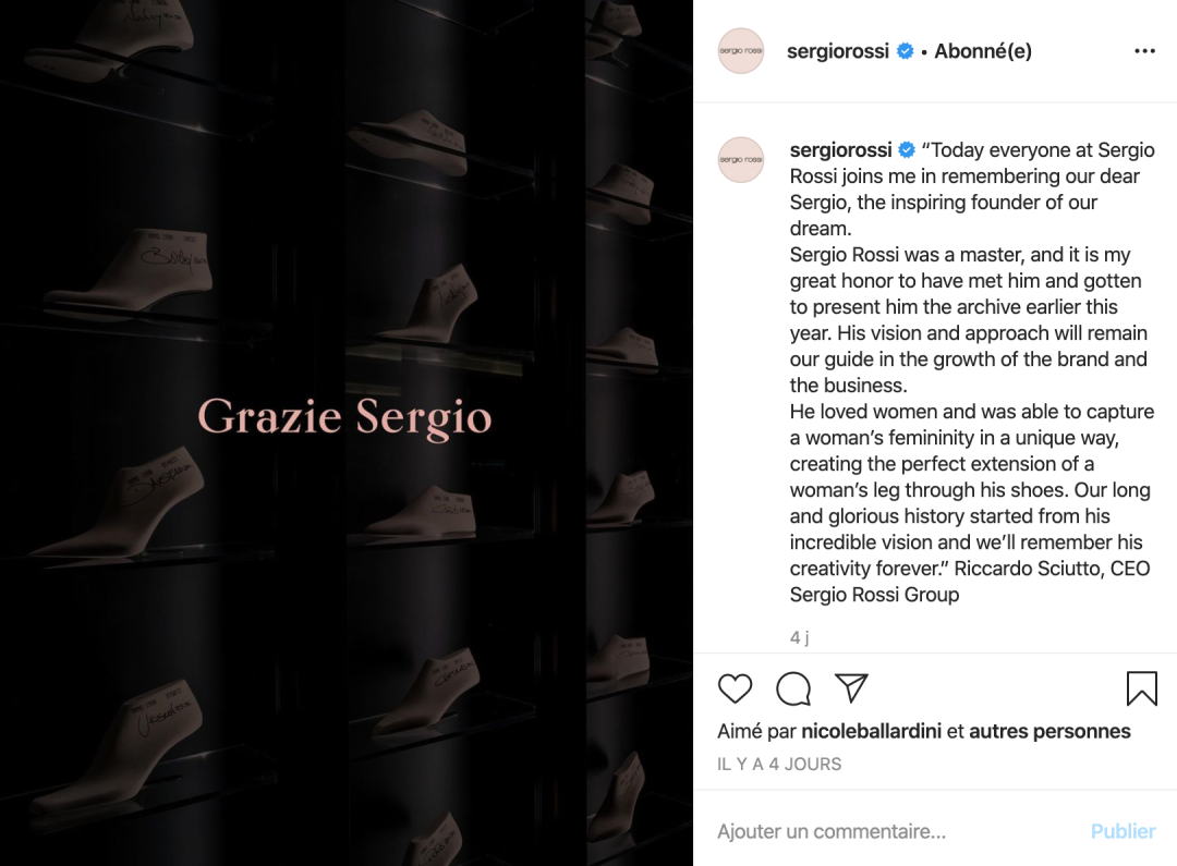 据说在意大利疫情爆发的第一时间,老先生就曾向米兰的医院捐献了10万欧元用于抗击新冠。4月3日当天,Sergio Rossi公司也发布公告,表达了对于这位传奇创始人的敬意和感谢。